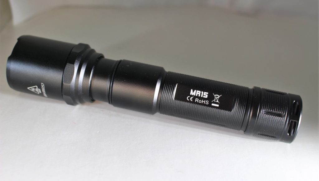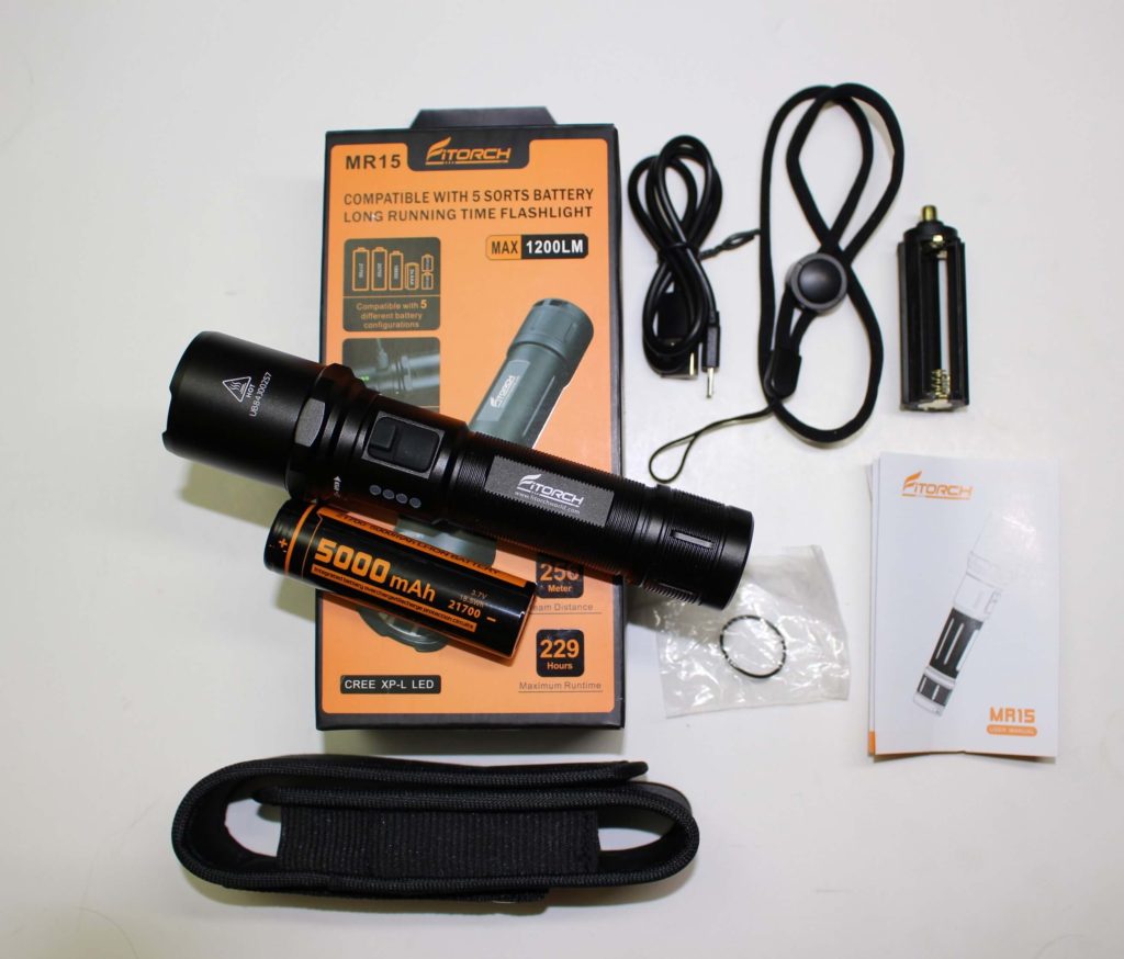 The MR15 comes in a nicely arranged package. There’s a belt holster, spare o-ring, micro USB cable, a battery adapter, a user manual, a lanyard, and a 5000mAh rechargeable 21700 3.7v battery