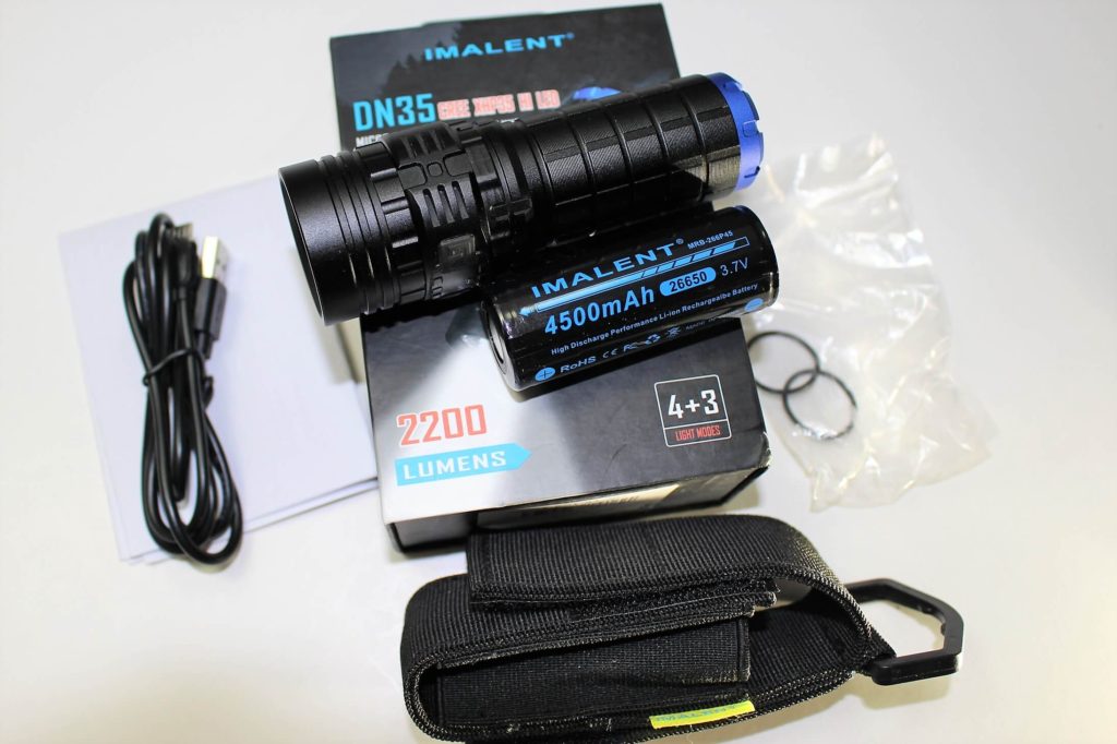 Within the familiar blue Imalent packaging, you’ll find the DN35, a couple of spare o-rings, a belt holster, a micro USB charging cable, and an Imalent 4500mAh 26650 rechargeable battery.