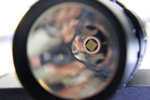 The LED is a CREE XHP35, “high intensity” which focuses the beam into a long-throwing cone of light. Beam distance is rated at 596 meters! That’s 651 yards!!