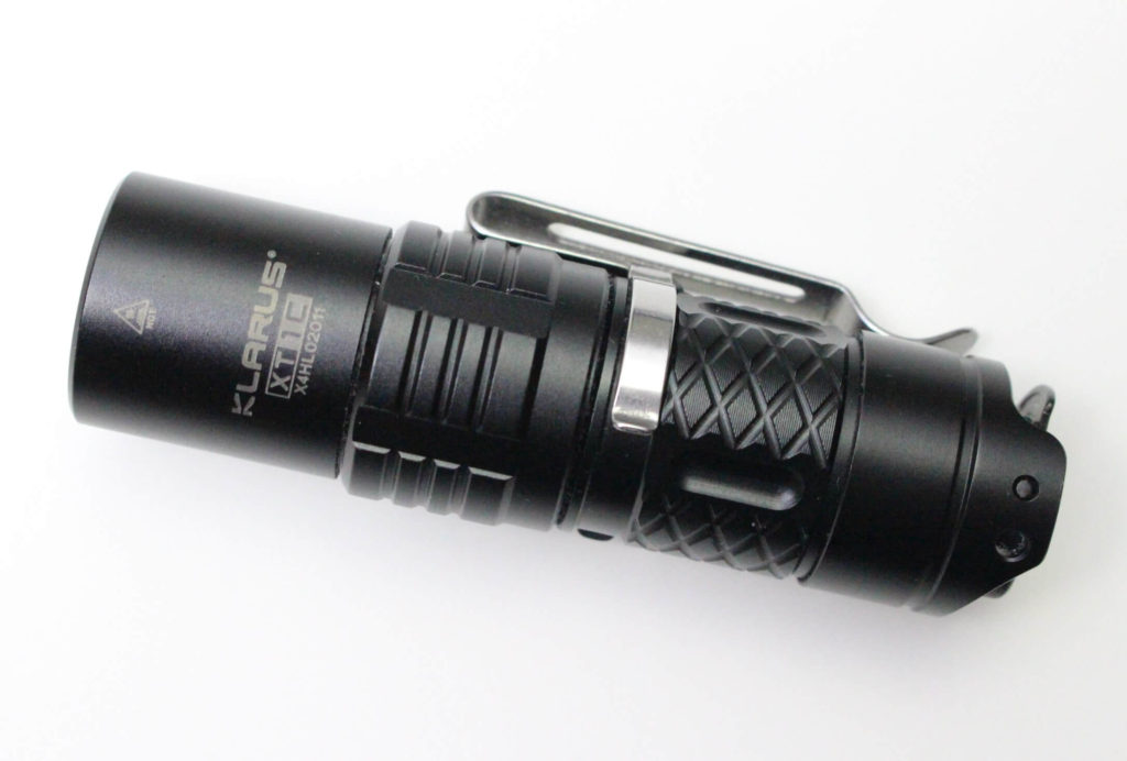 From the picture you can see that within Klarus’ familiar plastic, red packaging… comes an instruction manual, an accessory pack including a lanyard and a spare o-ring, a rechargeable 16340 battery, and the star of the show… an XT1C flashlight, with a pocket clip already attached.