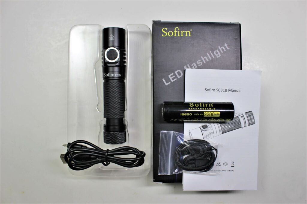 Along with the SC31B, is a USB charging cable…a packet with a lanyard and spare o-rings, a user manual, a Sofirn 2200mAh rechargeable 18650 battery, and a removable pocket clip. Not too bad.