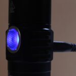 With the included cable, any 18650 battery can be charged inside the light. Just connect it to a USB source, and off it goes. The blue indicator beneath the switch will flash during the charging process. It will go steady blue when complete.