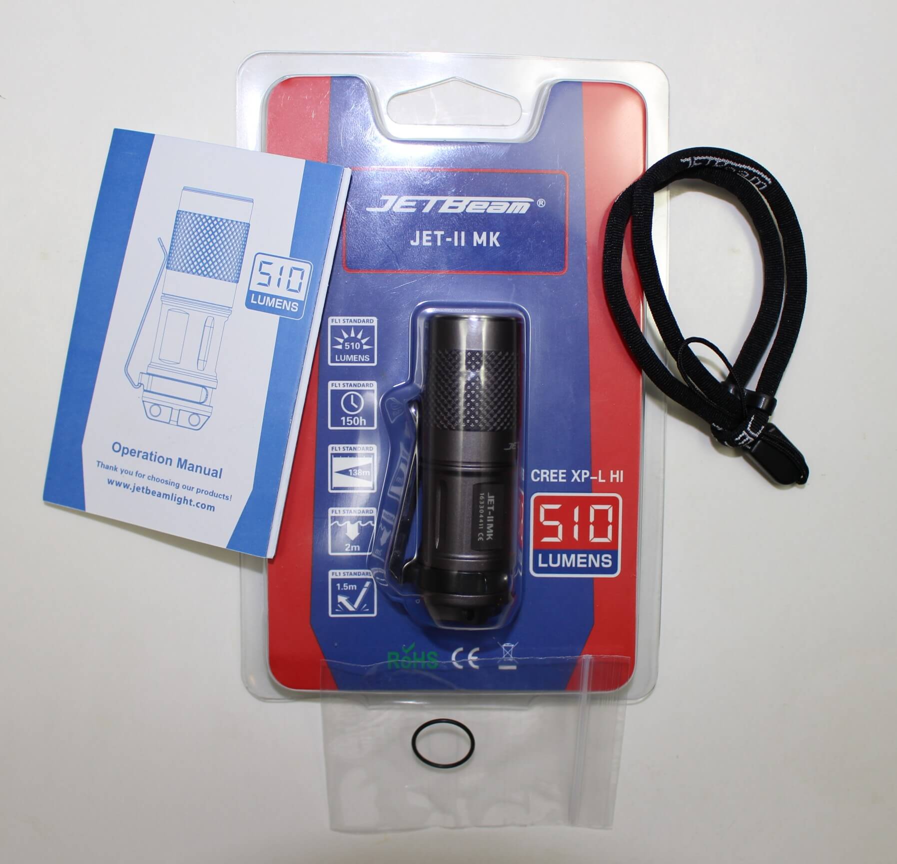 The Jet-II is nothing short of pint-size! Therefore its package is just as compact. Other than the flashlight, with a pocket clip already attached, there’s an owners manual, an adjustable lanyard, a spare o-ring and a warranty card.