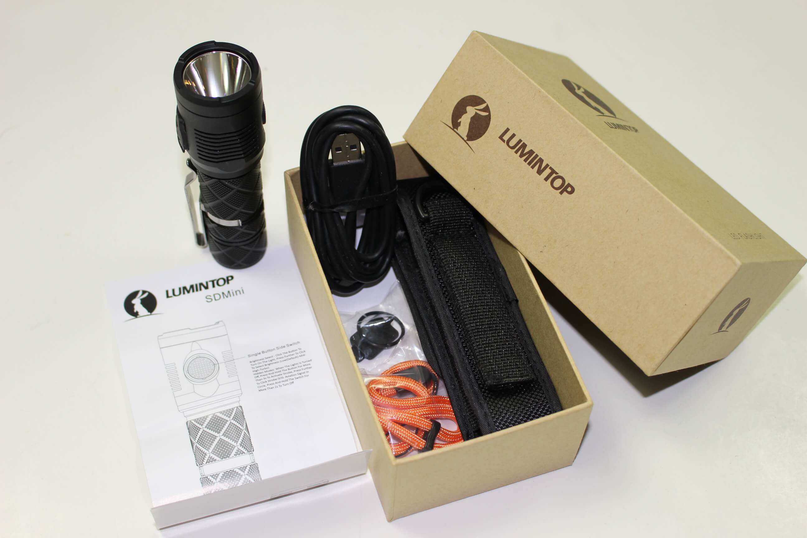 So, the SD Mini comes in the usual unpretentious, recycled brown, Lumintop box. The flashlight is nestled in a foam cutout and underneath are a host of well conceived accessories.