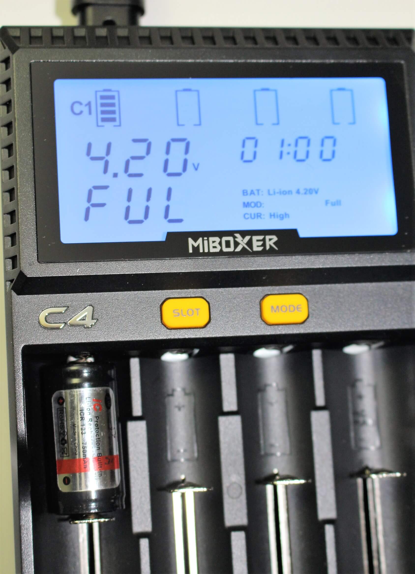 If you have more than one battery charging, press the “mode” switch to toggle back and forth from one slot to the next. That will give you an instant visual for what’s going on with EACH battery… separate from the others. The display will read “FUL” (within each corresponding slot) when the charge has completed.