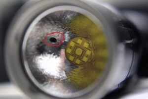 A built-in lens sensor is designed to lower output (to 300 lumens) when the beam is very close to a solid object. This ONLY works when on HIGH mode, and in my testing of the feature, you have to be holding it REALLY close to something!
