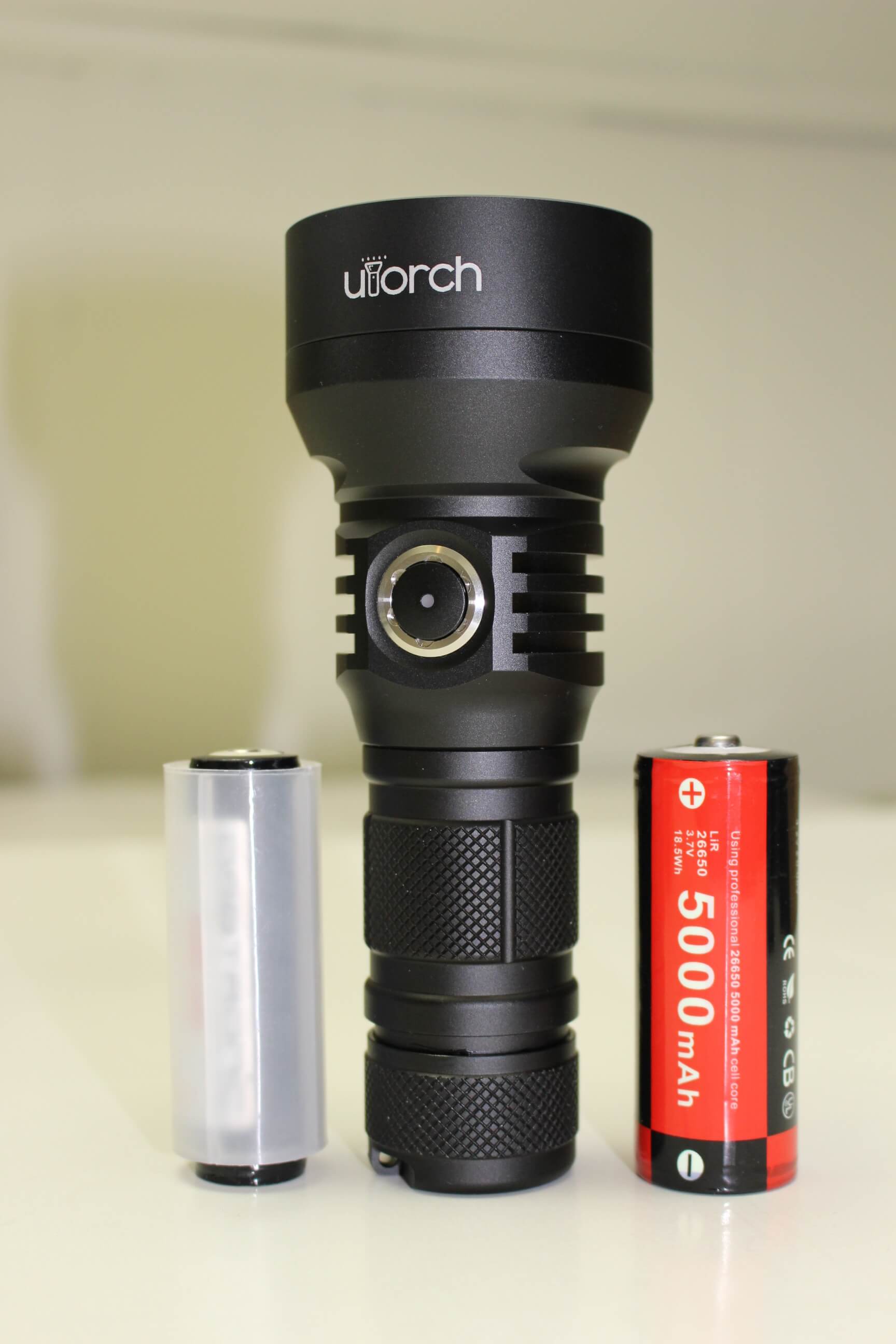 First and foremost, the UT02 operates on just one battery. This can be either a 3.7v rechargeable 26650 (recommended) or a 3.7v 18650. The flashlight tube is designed for a 26650, so to accommodate a thinner 18650, there’s a plastic insert included.